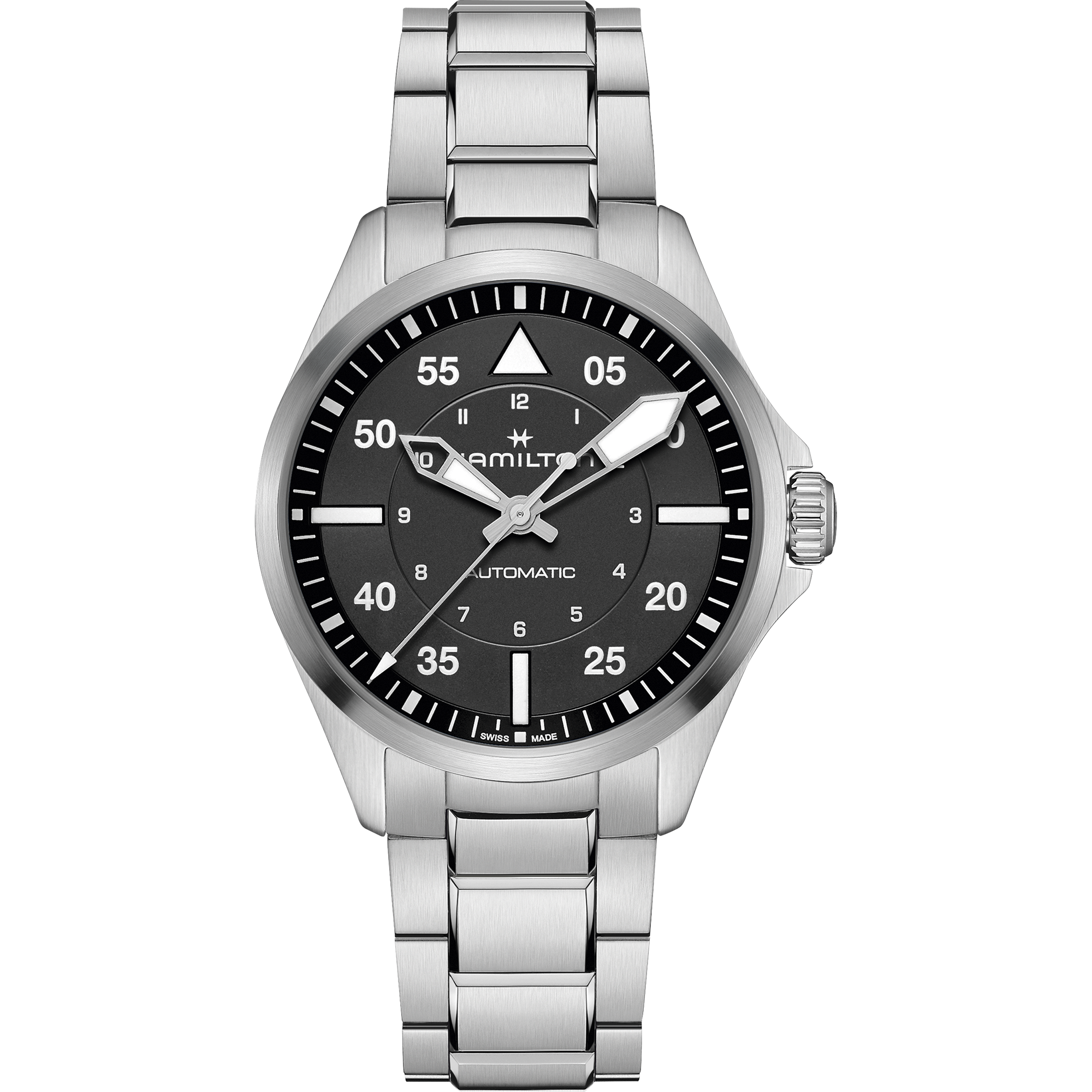 Crafted for true aviation lovers, the Khaki Aviation Pilot evokes the spirit of exploration and adventure of the Khaki. Powered by the H-10 automatic movement with an 80-hour power reserve and Nivachron™ balance spring. The Khaki Aviation 39mm sits on a brushed and polished stainless-steel bracelet paired with an all-black dial.