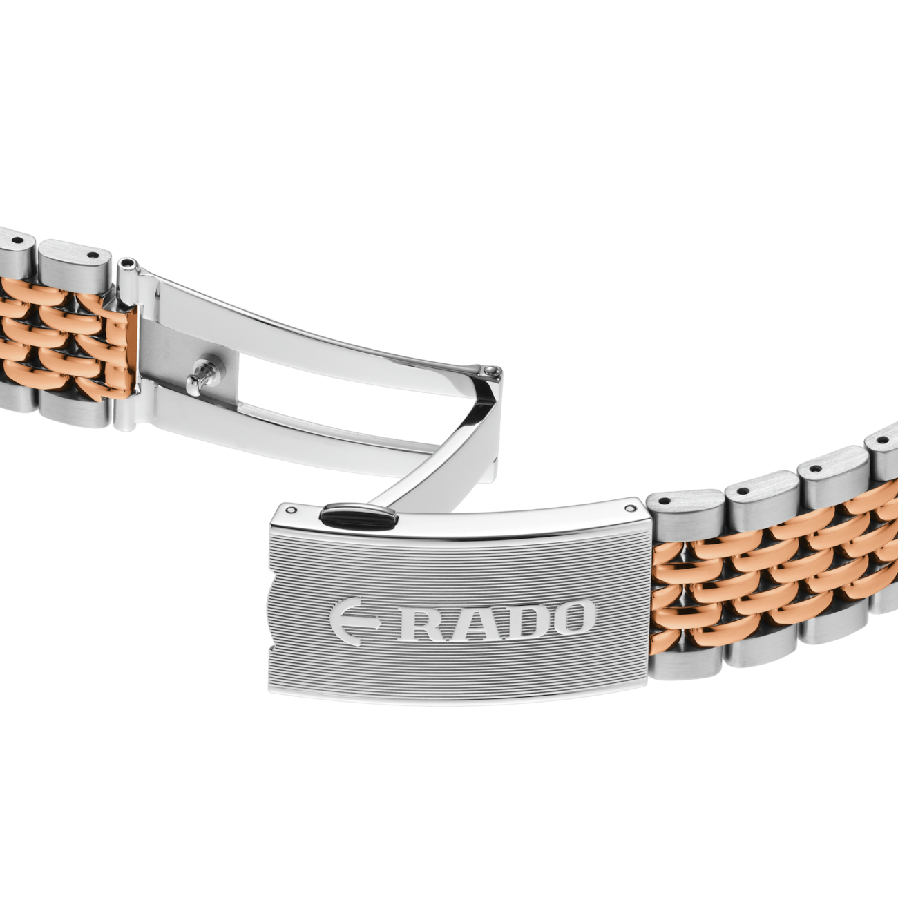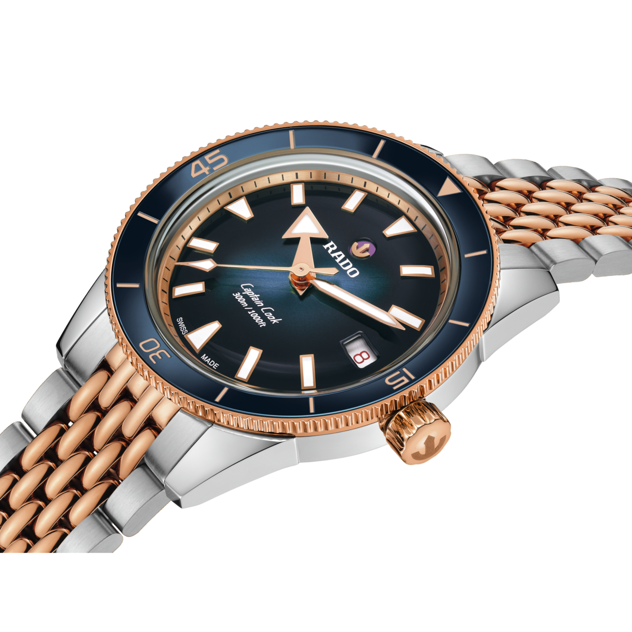 The first Captain Cook appeared in 1962, and remains an inspiration for today’s new versions. The vintage dive watch look seduces with colour: The rose gold-coloured middle links on the stainless steel bracelet and rose gold-coloured turning bezel and crown add lustre to the polished blue high-tech ceramic insert. The box-shaped sapphire crystal frames a splendid black-to-blue gradient dial with rose gold-coloured indexes and hands with Super-LumiNova highlights. This alluring interpretation of the iconic original is powered by the Rado calibre R763, a 25-jewel, three-hand automatic movement with an antimagnetic Nivachron hairspring for proven reliability and enhanced accuracy. Water-resistant to 30 bar (300m), the 39mm diameter case in stainless steel complements the existing 37mm and 42 mm case sizes, extending the appeal of the Captain Cook range to accommodate wrists of all sizes. Fitted with a rice grain style stainless steel bracelet, this contemporary Captain Cook sounds a timeless call to adventure.