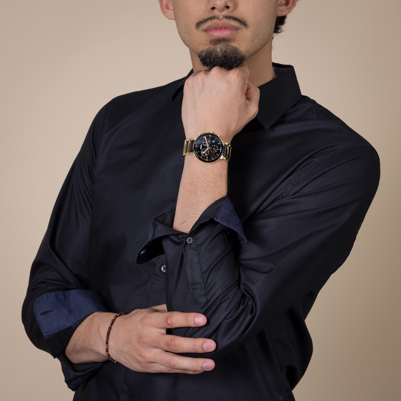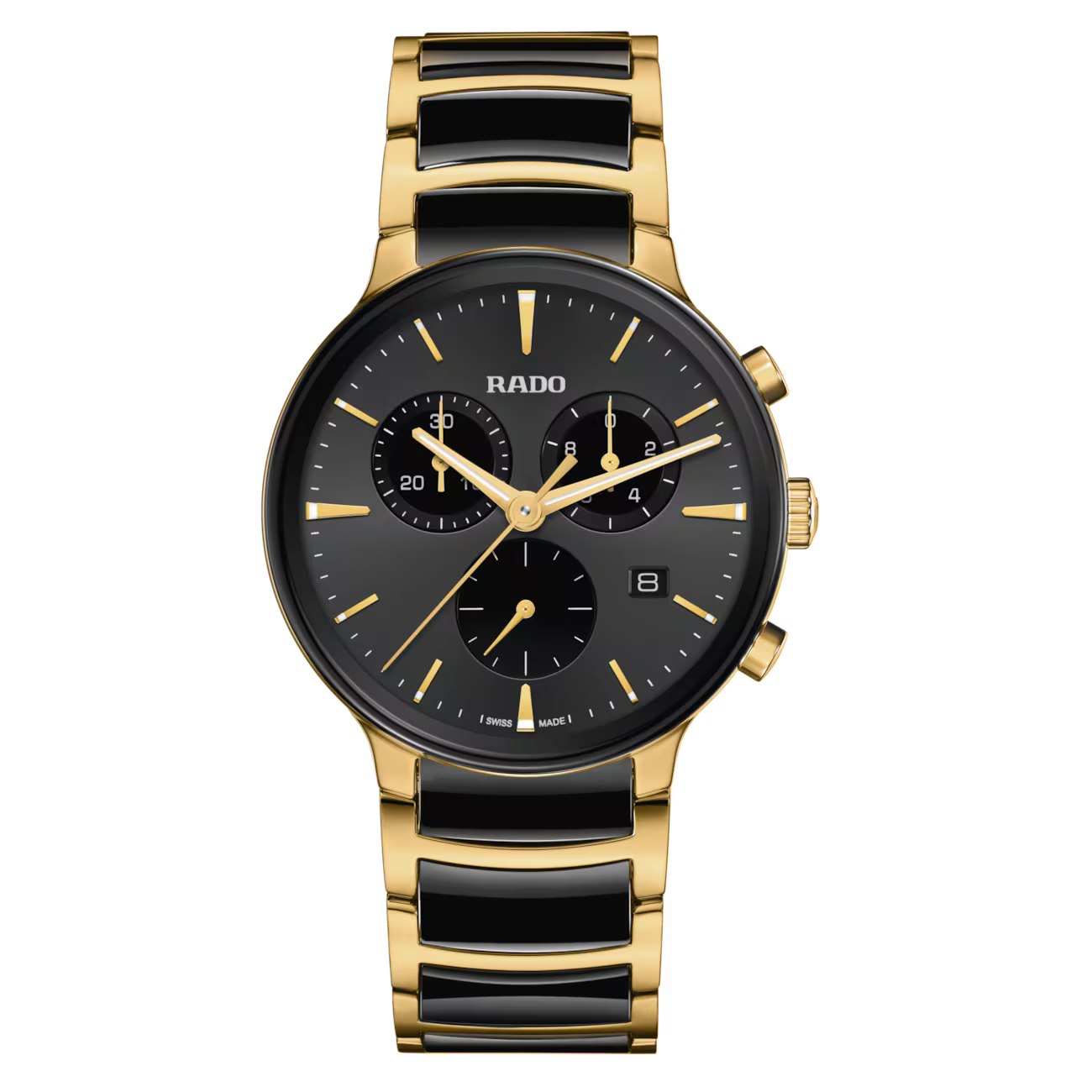 Experience the harmonious blend of artistic expression and refined design with the Centrix Chronograph. Crafted in stainless steel and treated to a yellow gold-coloured PVD coating, the 41 mm case is crowned with a curved sapphire crystal with anti-reflective coating on both sides, ensuring impeccable readability. Beating at its heart, the Calibre R312 quartz chronograph sets a new standard of precision. Equipped with 22 jewels and a six-hand configuration, this movement integrates Precidrive and Heavydrive technologies to ensure unwavering accuracy of +/- 10 seconds per year. The black sunray dial, enhanced by yellow gold applied indexes with white Super LumiNova®, exudes refined sophistication. Three meticulously arranged counters include a 30-minute counter, a one tenth of a second tracker offering precise chronograph functionality, and a small seconds at 6 hour. The discreet date window at four o’clock adds a touch of practical elegance. The overall appearance of this iconic timepiece is completed with elegantly adjusted case lugs and a bracelet made of polished stainless steel treated to a yellow gold-coloured PVD coating with black high-tech ceramic middle links, secured by a triple-fold brushed stainless steel clasp.