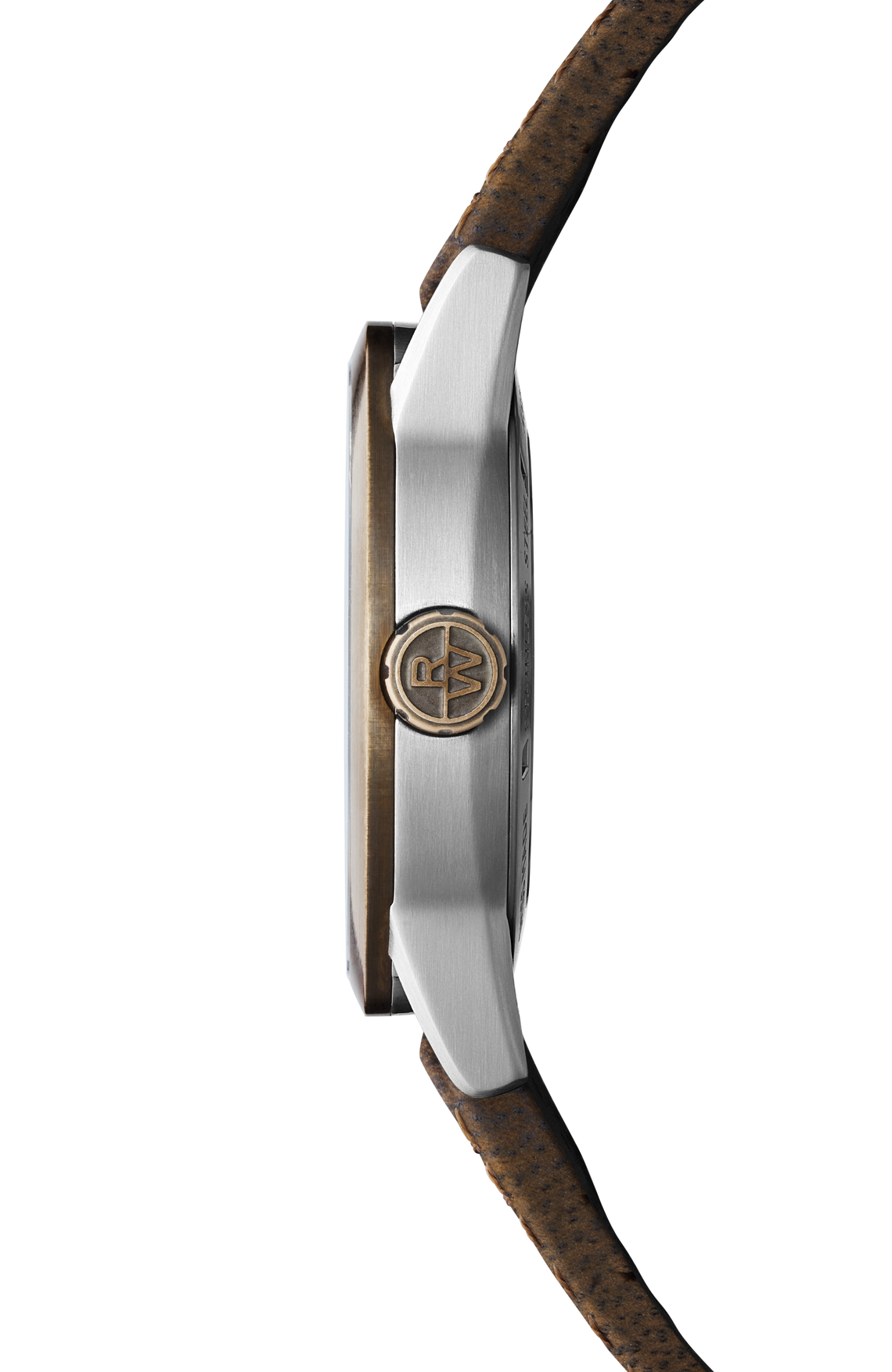 Revered by man and one of the earliest metal alloys created, Bronze defined a significant evolution for mankind and has captivated him ever since. Combining materials from the past with Swiss precision craftsmanship of today is the latest freelancer skeleton Calibre RW1212 from RAYMOND WEIL. Housed in a 42mm stainless steel case with solid bronze bezel, each watch has a unique, rich patina and self-indulgent lustre. Ambitiously re-invented with a fully skeletonised dial, this new design provides more transparency and depth to the balance wheel at 6 o’clock illustrating the technical ingenuity to the exclusive, in-house developed movement. An aged, brown leather strap completes the sophisticated aura and independent bearing of this remarkable watch.