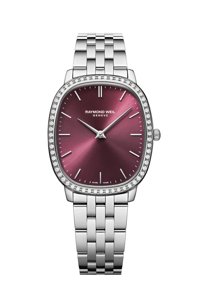 Raymond Weil Toccata Heritage Quartz full diamond bezel red grape dial on Steel Bracelet -31mm x 36mm