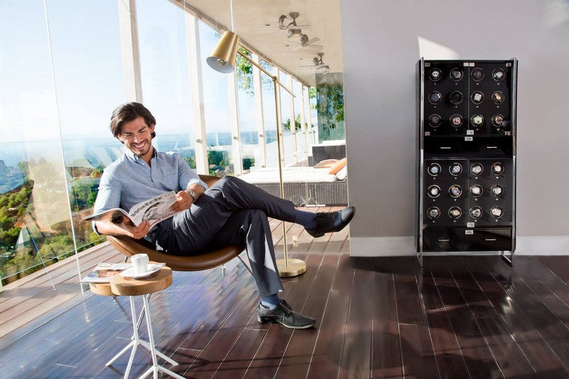 FEATURES Quad angled panelled lid Avaliable as green with gold or black with gunmetal hardware Lock and key security Suspended watch cushions Smart watch...