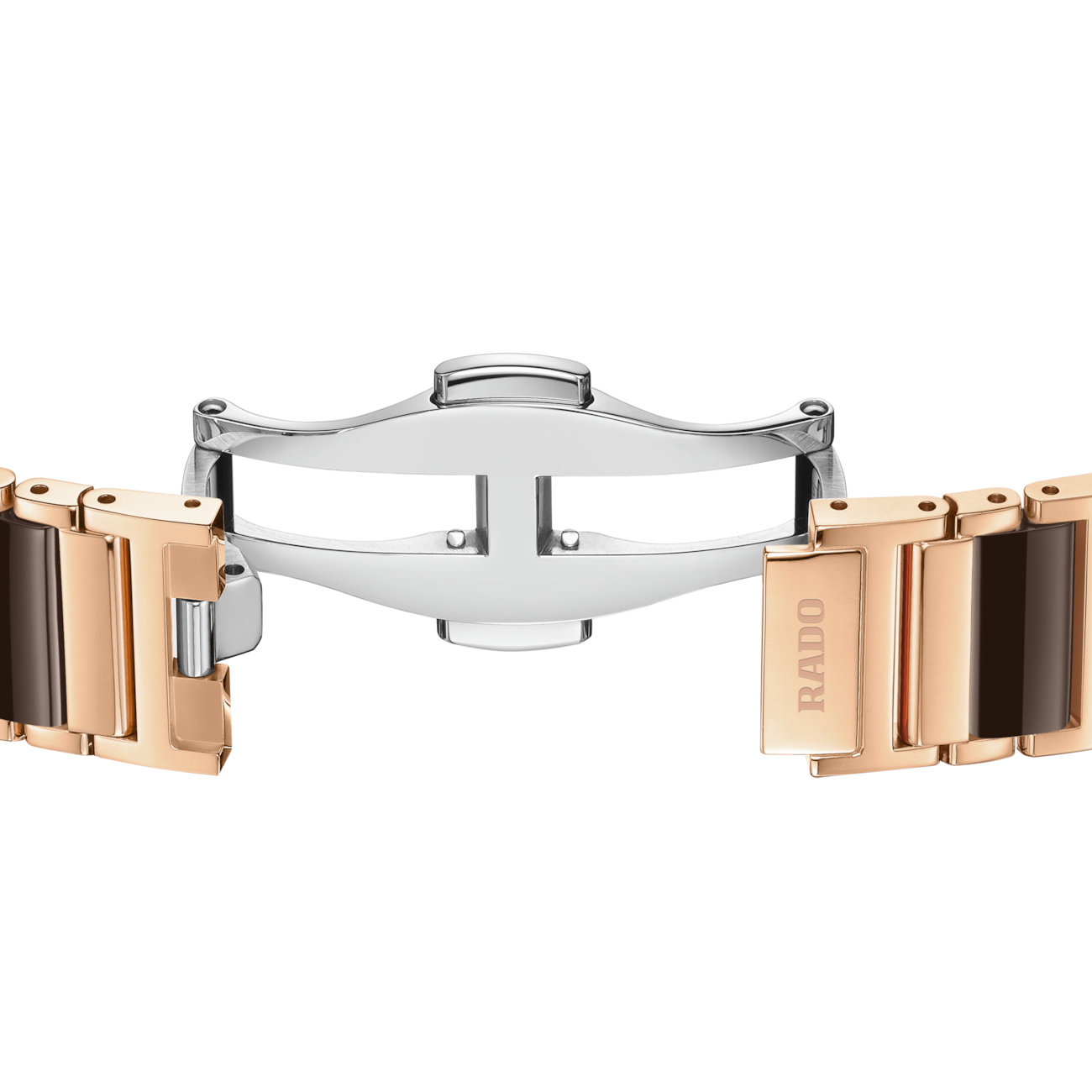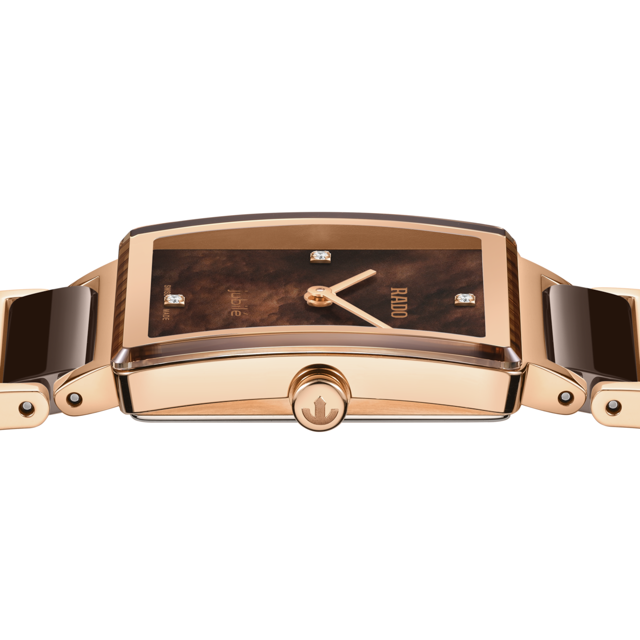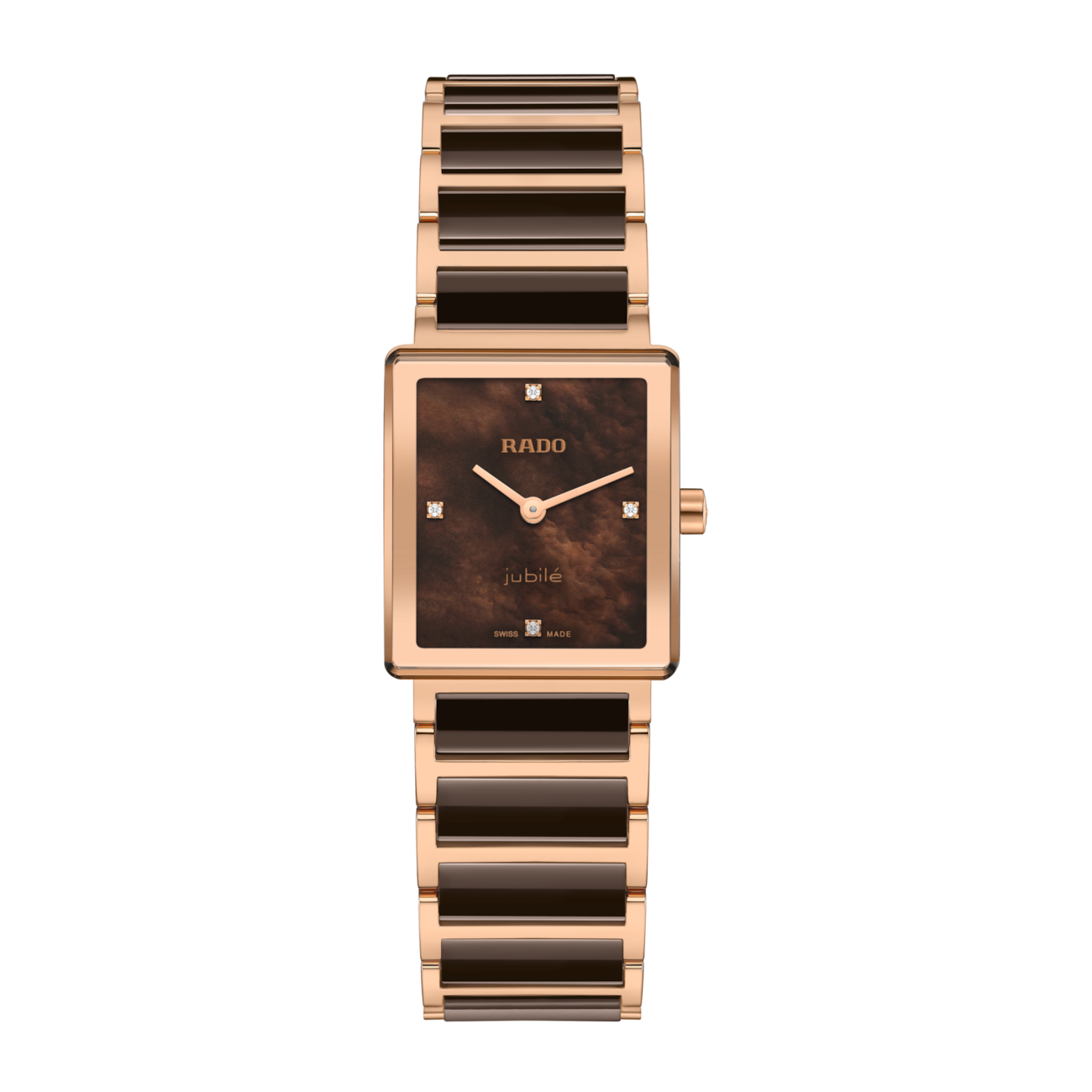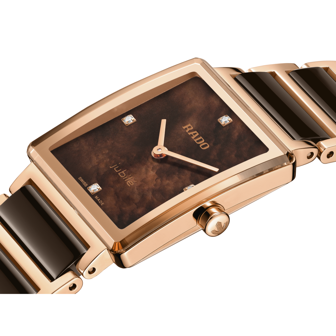 At first glance you take in the Rado four-diamond dial, the rose gold colouring and the high-tech ceramic links. A traditional Rado Integral. And then you take a closer look – at the dial – yes, it’s mother-of-pearl, in brown. Exceptional. Eye-catching. Elegant. The stainless steel case with a polished rose gold PVD surface is flanked by a stainless steel bracelet with rose gold-coloured PVD and polished brown high-tech ceramic links. Rose gold-coloured metallization frames the anti-reflective, curved and bevelled sapphire crystal protecting the lustrous mother-of-pearl dial. The minimalist, signature Rado design is powered by the R209 quartz movement: Swiss-made precision in a 6-jewel two-hander. The sapphire crystal glass and high-tech ceramic links ensure comfort, and the curves of the glass align with the bracelet as it adapts to the curve of your wrist (a detail for the connoisseur). An iconic Rado Integral, enhanced by a disarmingly elegant mother-of-pearl dial.